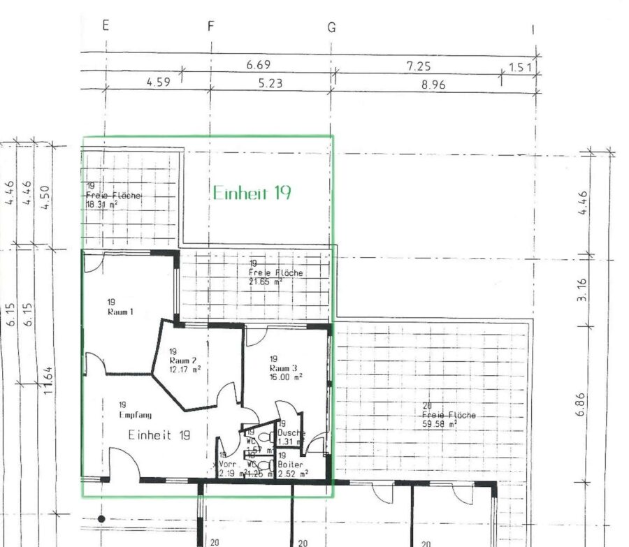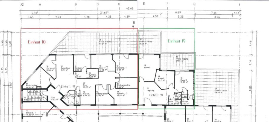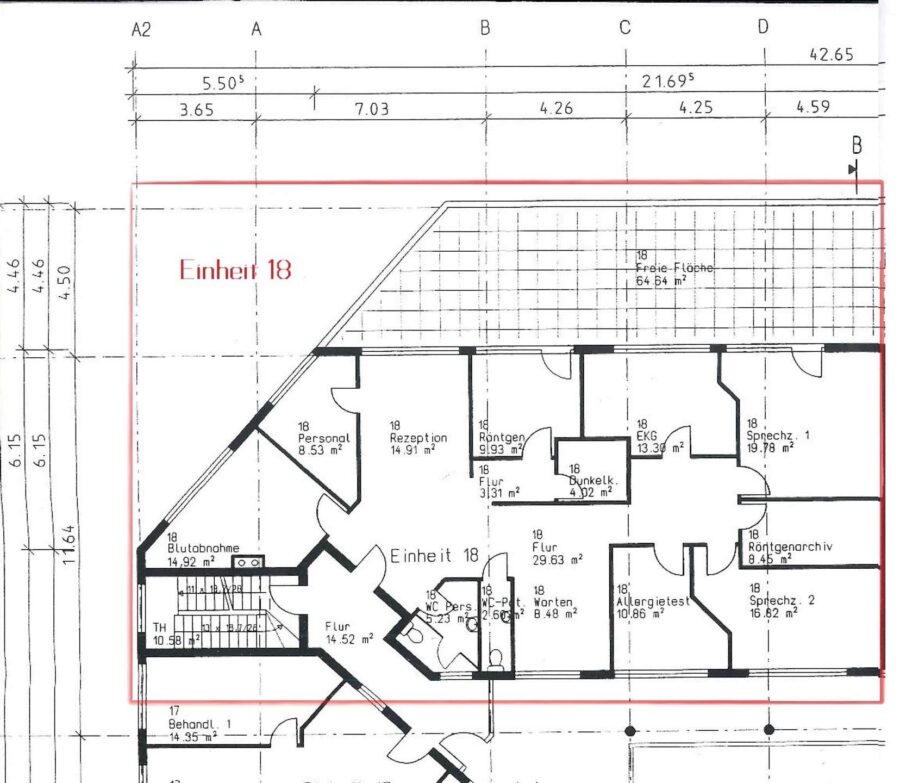 Die schon seit langem vermietete Arztpraxis nutzt eine Fläche von rund 171 m² (zzgl. Terrasse), schließt sich nahtlos an die Einheit Nr. 18 an und verfügt über folgendes Raumprogramm: