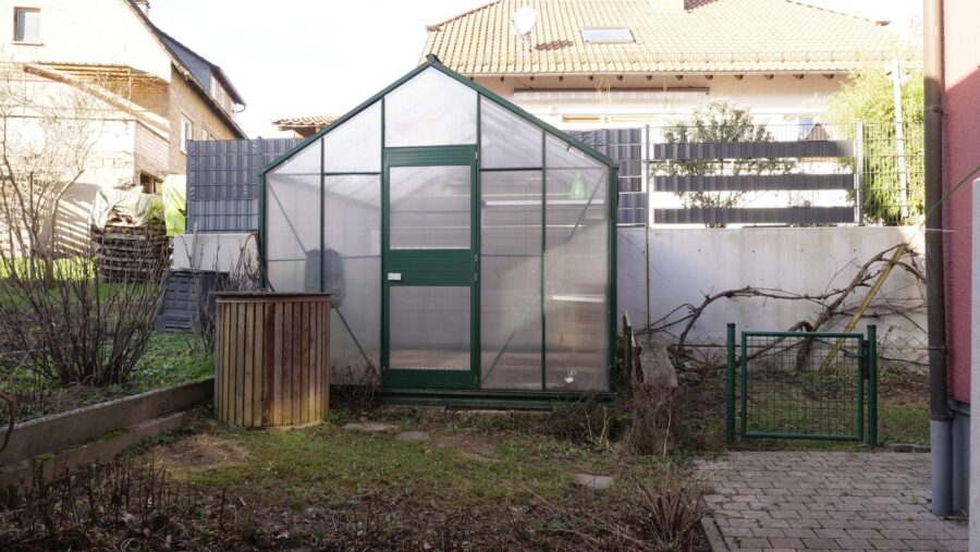 Der Garten ist liebevoll angelegt und umrahmt das Haus. Hier finden sich ein Gewächshaus und eine kleine Kletterhütte – perfekt für Gartenfreunde und Familien mit Kindern. Ein Carport mit Geräteschuppen sowie ein zusätzlicher Außenstellplatz ergänzen das Angebot.