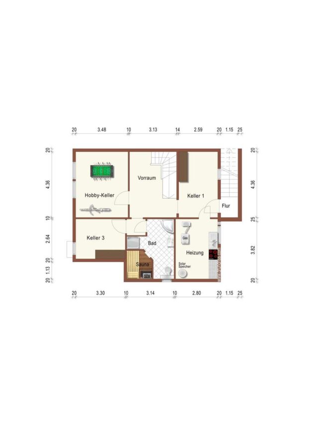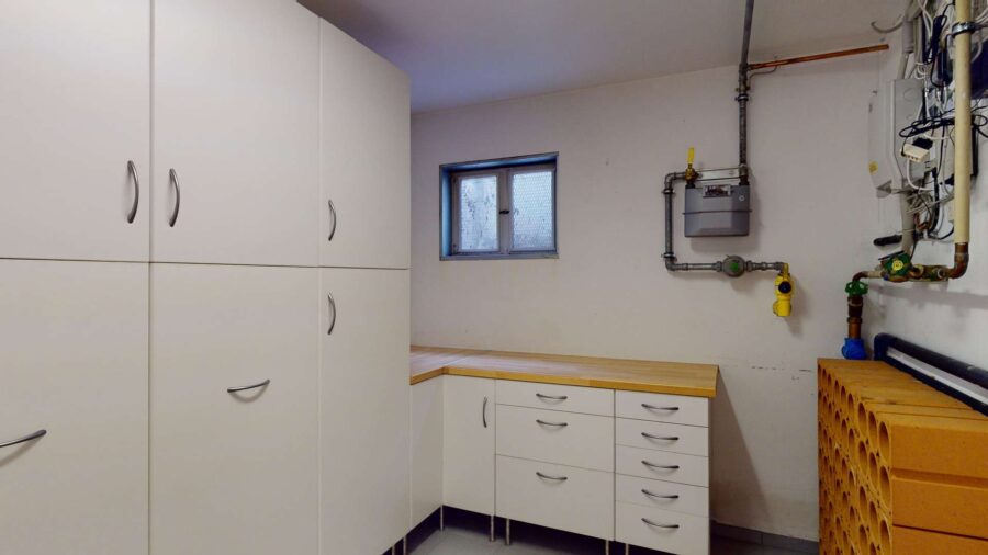 Im Untergeschoss befinden sich ein wohnlich ausgebauter Hobbyraum, zwei Kellerräume, ein größeres Bad mit Sauna sowie der Heizungs- und Technikraum. Eine Außentreppe führt direkt in den Garten.