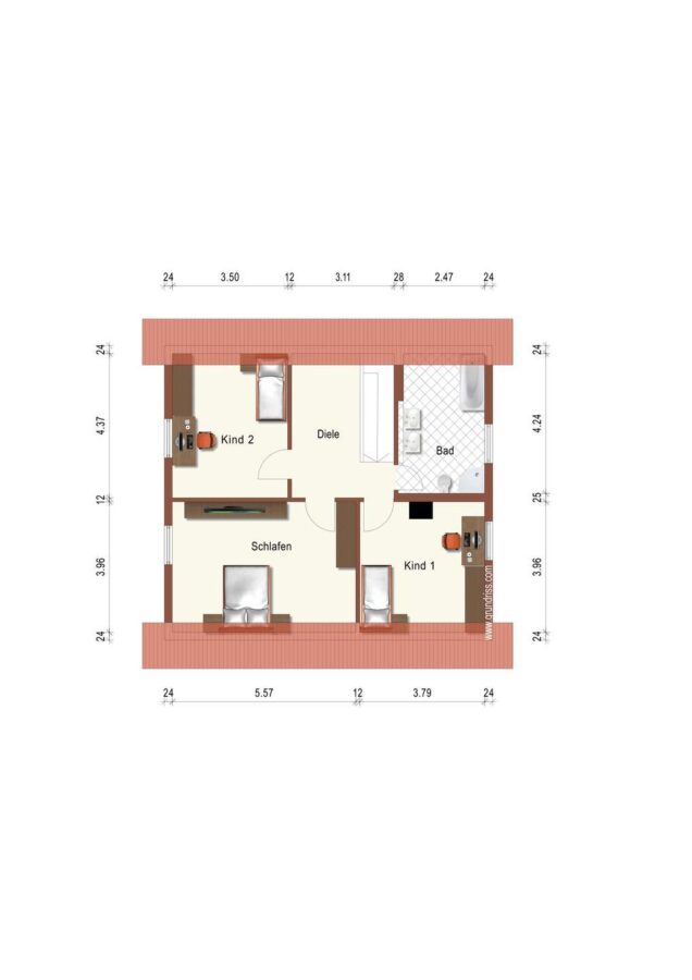 Im Dachgeschoss erwarten Sie ein großzügiges Tageslichtbad, ein Schlafzimmer und zwei Kinderzimmer. Der Spitzboden bietet zusätzliche Nutzfläche als Stauraum oder Spielbereich.