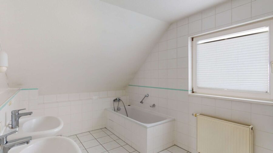 ✔ Großes Tageslichtbad im OG mit Wanne, Dusche, Doppelwaschbecken & WC – modern, hell & raumhoch gefliest