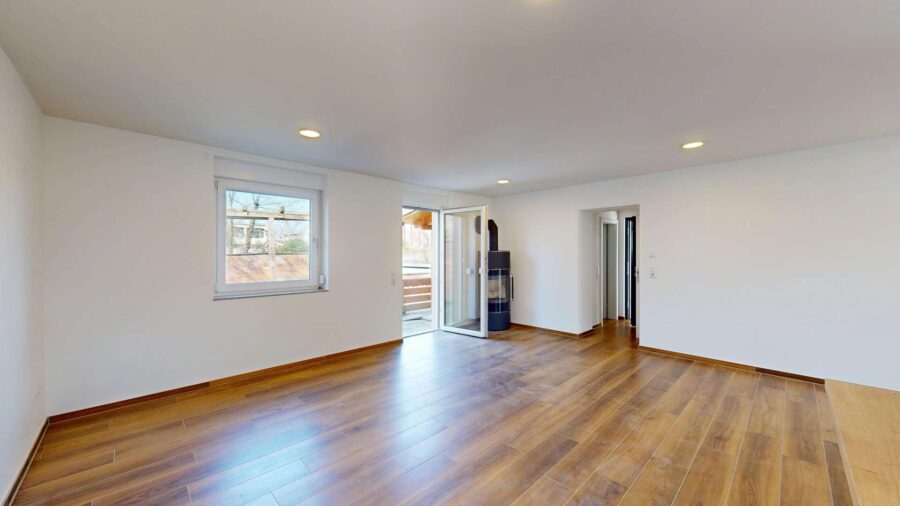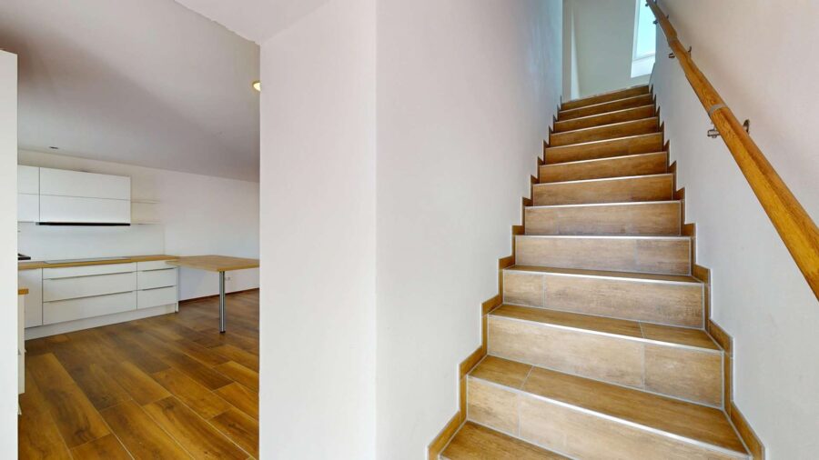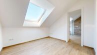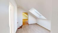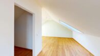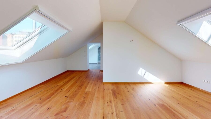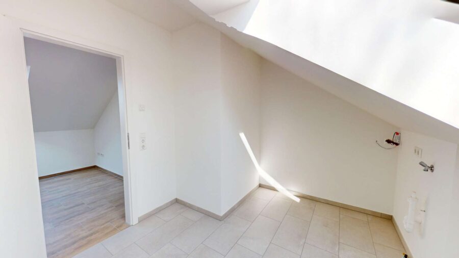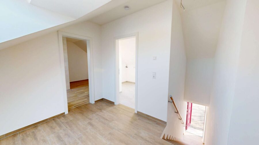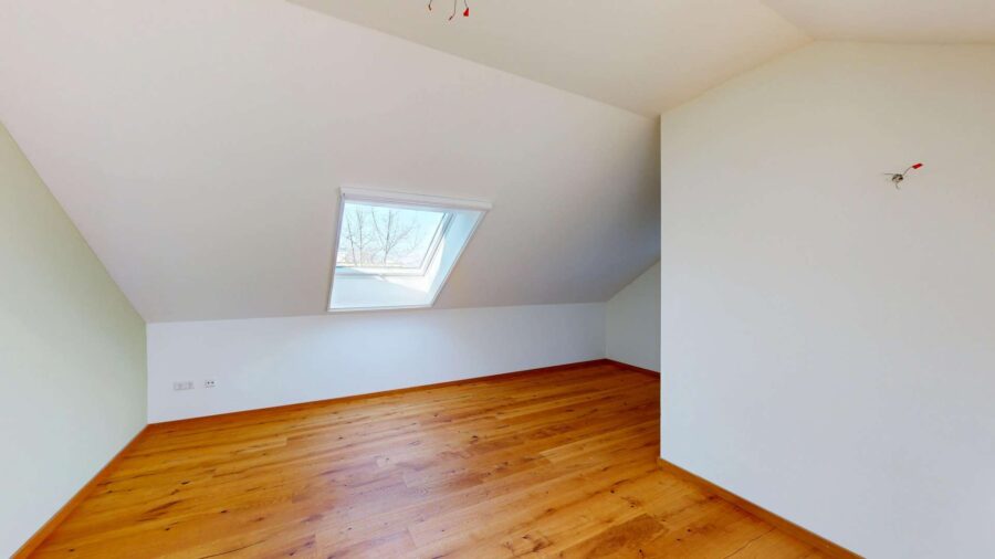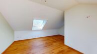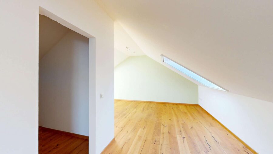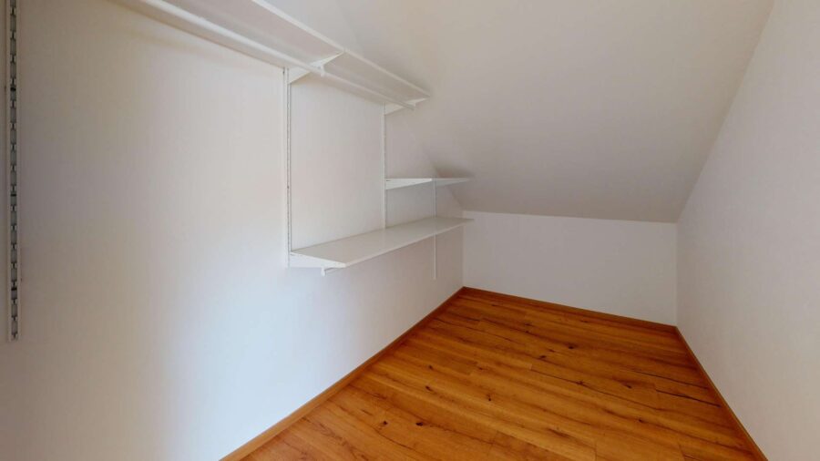 Das Obergeschoss bietet ein großzügiges Schlafzimmer, das durch große Fenster und eine angenehme Raumaufteilung für viel Licht und Komfort sorgt. Direkt im Schlafzimmer befindet sich ein praktischer Abstellraum, der sich auch als begehbarer Kleiderschrank nutzen lässt. Ein weiteres kleines Zimmer im Obergeschoss eignet sich perfekt als Kinderzimmer, Arbeitszimmer oder Gästezimmer.
