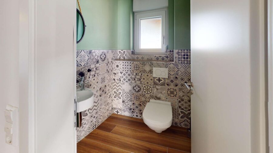 Im Erdgeschoss erwartet Sie ein offener und lichtdurchfluteter Wohnbereich. Der Wohnraum geht nahtlos in das angrenzende Esszimmer über, das zusammen mit der offenen Küche einen perfekten Rahmen für gesellige Stunden und das gemeinsame Kochen bietet. Ein praktischer Abstellraum sorgt für zusätzlichen Stauraum und Ordnung. Das Gäste-WC im Erdgeschoss ist ebenfalls modern und funktional. Vom Wohnzimmer aus haben Sie direkten Zugang zur Terrasse und dem Garten, den Sie ideal für private Momente im Freien ist und nach Ihren Vorstellungen gestalten können.