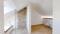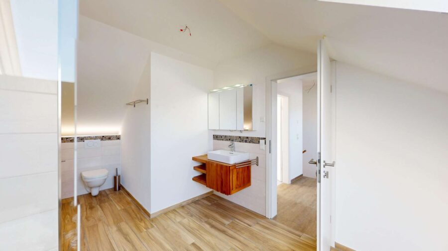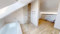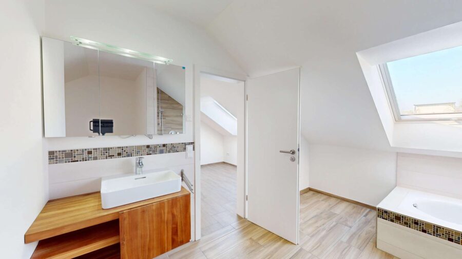 Das moderne Tageslichtbad ist ein echtes Highlight der oberen Etage: Eine bodentiefe Dusche, eine Badewanne und hochwertige Sanitäreinrichtungen bieten den perfekten Raum für Entspannung. Durch die großen Fenster dringt viel natürliches Licht in den Raum und sorgt für eine angenehme Atmosphäre.