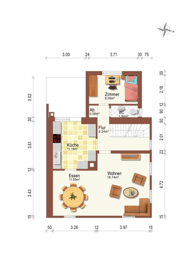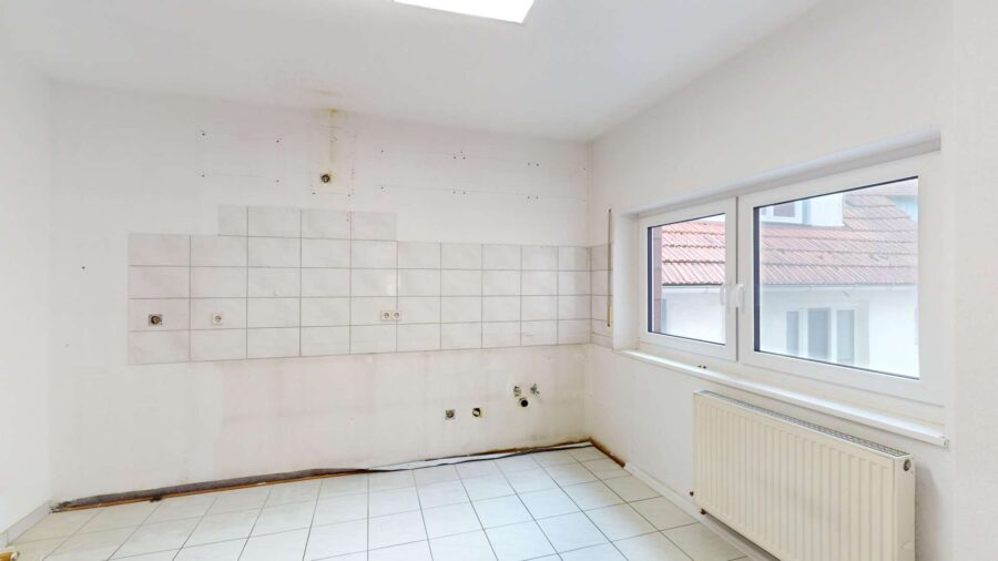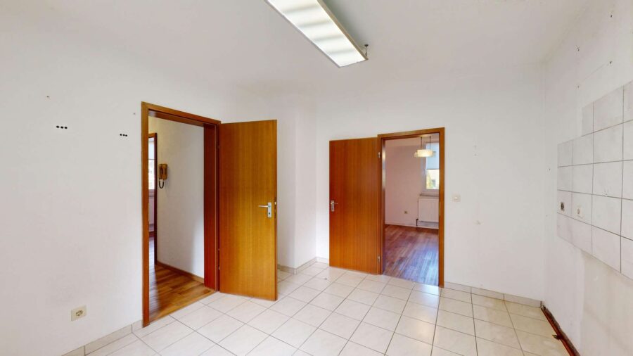 Großzügiges Wohn- / Esszimmer mit viel Licht, funktionale Küche, separates Zimmer (z. B. als Büro oder Gästezimmer nutzbar), Flur, Abstellraum, sep. WC