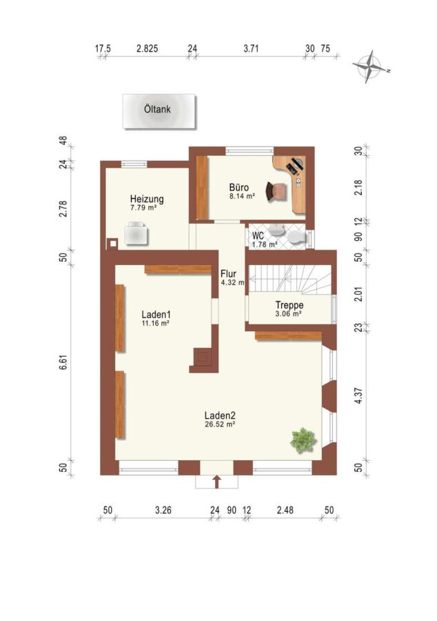- Erdgeschoss (Gewerbefläche – ca. 52 m²) zzgl. Heizungsraum: