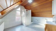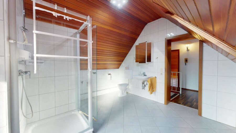 - Großzügiges, raumhoch gefliestes Tageslichtbad mit Dusche, Waschbecken, WC, Badschrank, WMA
