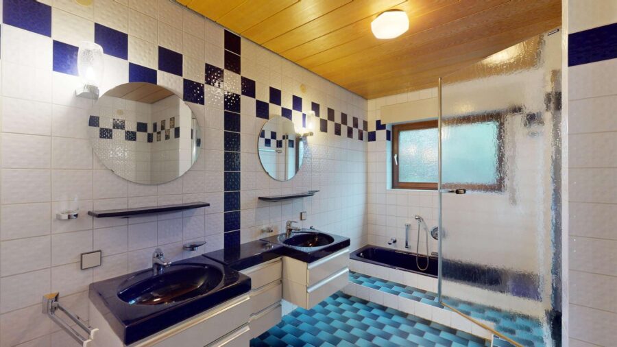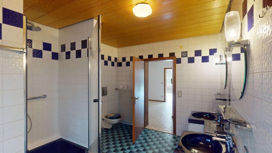 - Großzügiges Tageslichtbad mit Wanne, Dusche, zwei Waschbecken und WC