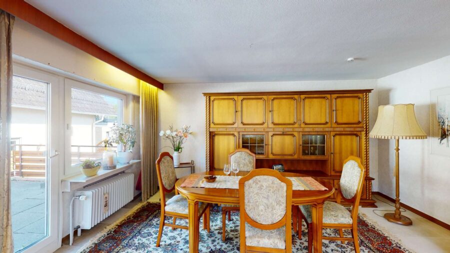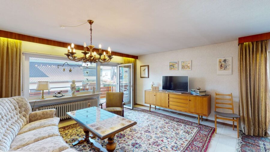 ✔ Großes Wohnzimmer (Anbau 1969) mit Loggia in Südwest-Ausrichtung und Zugang zur ca. 25 m² Terrasse über den Garagen