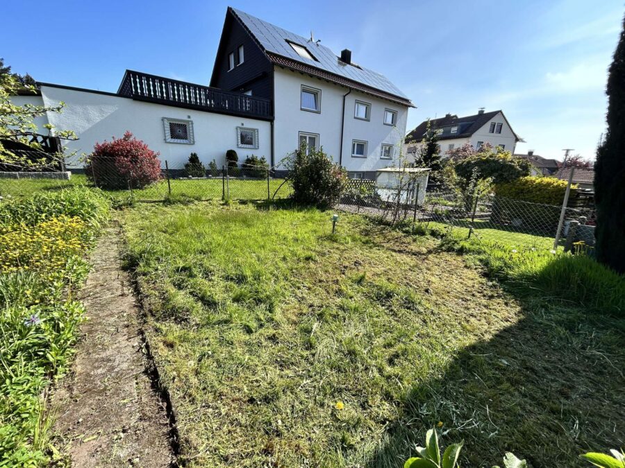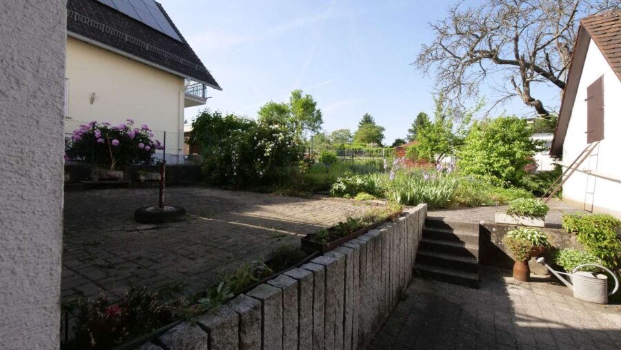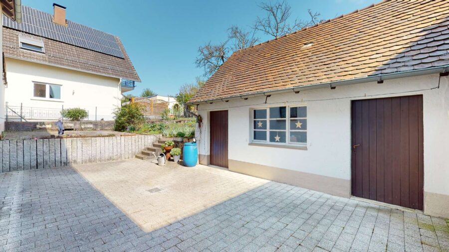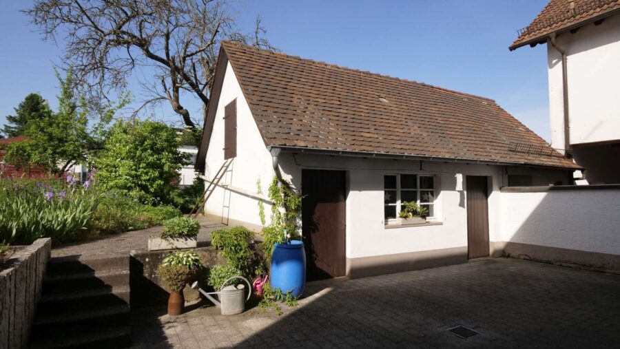 Der Zugang erfolgt rückseitig über den Hofbereich zwischen Garagen und Wohnhaus. Hier liegt auch der geschützte Garten mit Terrasse und ein praktisches, 1,5-geschossiges Scheunengebäude.