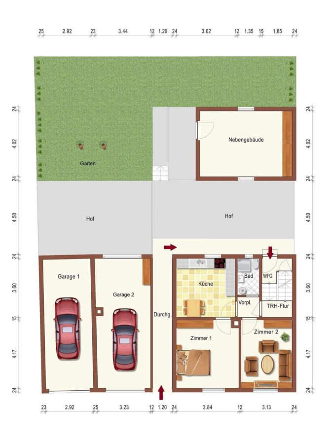 ✔ 2 Garagen, rechts mit Durchfahrt in den Garten