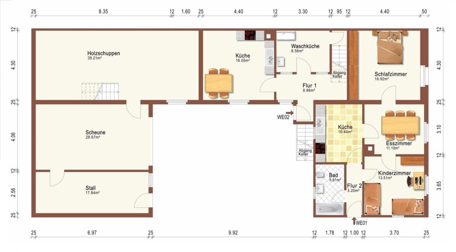 WE01 (EG Gebäude 1): Schlafzimmer, Kinderzimmer, Esszimmer, Küche, Bad, Flur, Keller (Zugang von außen)