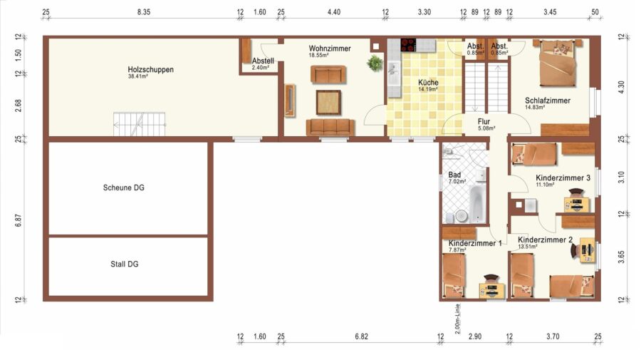 Das Ursprungshaus (Gebäude 1) ist sicherlich vor dem Jahr 1908 erbaut worden. Als linke Doppelhaushälfte ist es direkt an das Haus des rechten Nachbarn angebaut und verfügt über einen kleinen Kellerbereich. 1927 ist dann ein voll unterkellerter Neubau (Gebäude 2) entstanden, der anfänglich vom Bestandshaus getrennt gewesen ist. Beide Bauwerke sind dann 1941 integriert worden. Und im Laufe der Jahre hat sich der innere Ausbau immer wieder geändert. Im derzeitigen Zustand umfasst es eine Gesamtwohnfläche von rund 193 m² mit 2 Wohneinheiten, die wie folgt aufgeteilt sind: