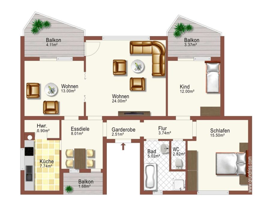 2 Wohnzimmer mit einer Verbindungstür und Zugang zum großen Balkon. Schlafzimmer. Kinderzimmer mit Balkon. Küche mit EBK und anschließendem Hauswirtschaftsraum mit WMA. Essdiele mit Loggia. Helles Tageslichtbad mit Eckbadewanne und Dusche. Separates WC. Flur mit Garderobe.