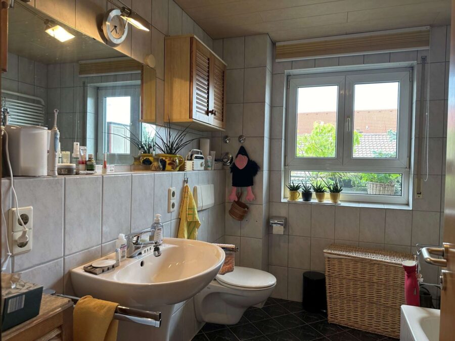 ✔ Modernes Tageslichtbad: weiße Sanitärkeramik, Wanne, WC, Waschbecken, Handtuchheizkörper
