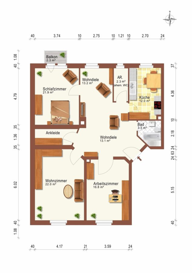 Wohnzimmer, Schlaf- / Arbeitszimmer, Schlafzimmer mit Zugang zum Balkon und Abstellraum (begehbarer Kleiderschran), Wohndiele, Küche, Badezimmer, Abstellkammer (war früher WC), Keller