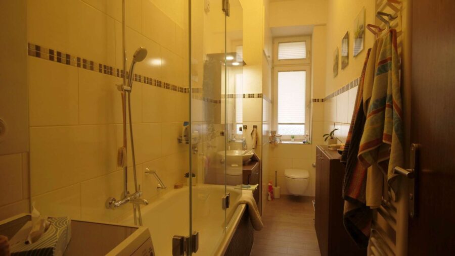 Die Küche bietet ausreichend Gestaltungsmöglichkeiten und ist derzeit mit einer Mieter-eigenen Einbauküche ausgestattet. Das modernisierte Tageslichtbad mit Wanne sorgt für eine angenehme Atmosphäre.