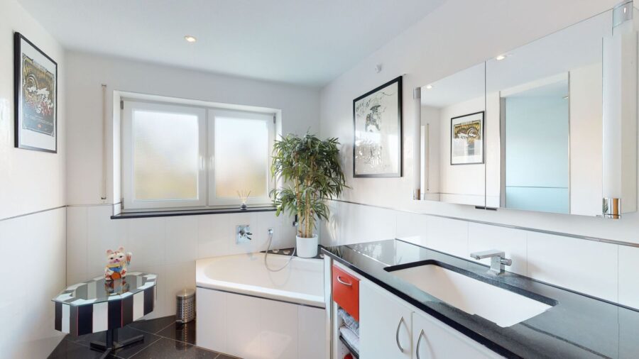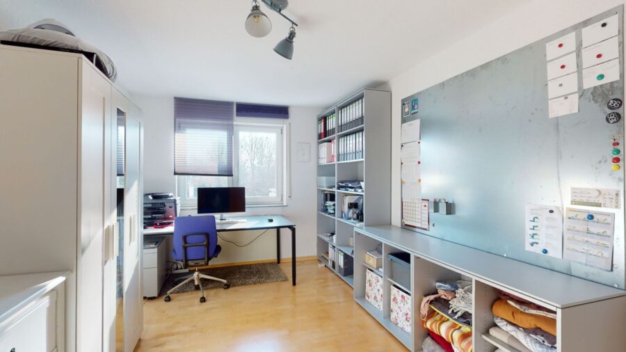 Über den zentralen Flurbereich sind die anderen Räume wie das Schlafzimmer und das Kinder- / Bürozimmer geschickt erreichbar. Hinzu kommen noch ein größerer Abstellraum sowie das exklusive Tageslichtbad: Hier ist neben der Eckbadewanne auf Extrawunsch eine bodentiefe Dusche in den separaten WC-Raum eingebaut worden.