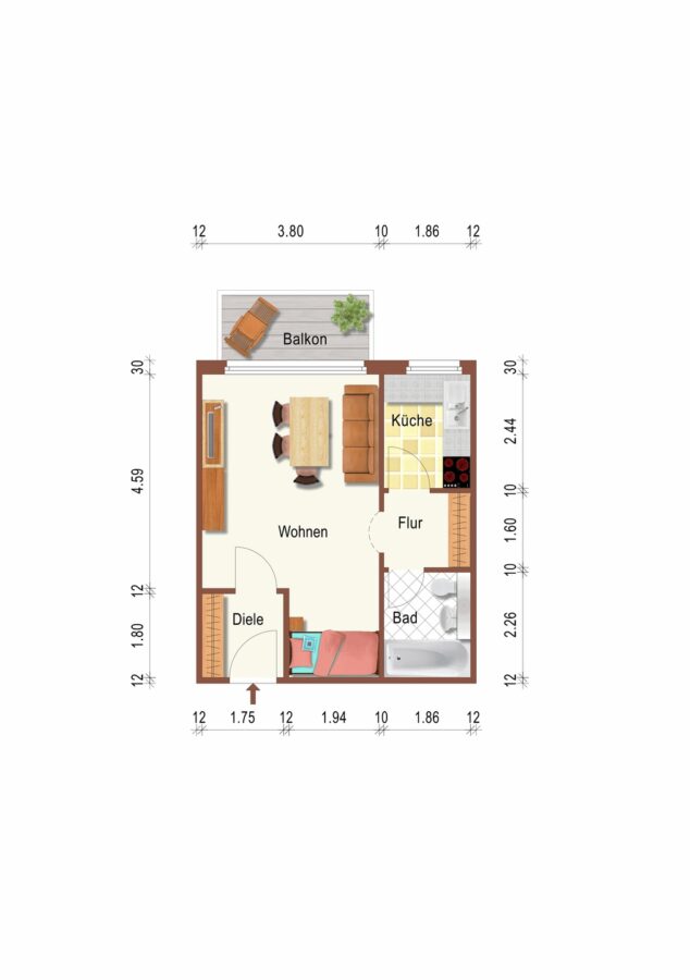 Wohn- / Essbereich mit Balkonzugang, Küche, Badezimmer mit Badewanne, Flur, Eingangsbereich, Kellerabteil