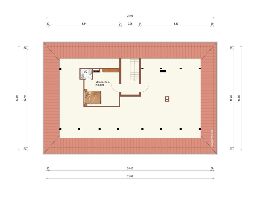 Ergänzt wird die Wohnung durch ein ausgebautes Mansardenzimmer mit WC im DG (2. OG). Es verfügt über eine Wohnfläche von rund 19 m², ist über das Treppenhaus zu erreichen und lässt sich gut als Kinder- / Gäste- / Bürozimmer nutzen.