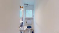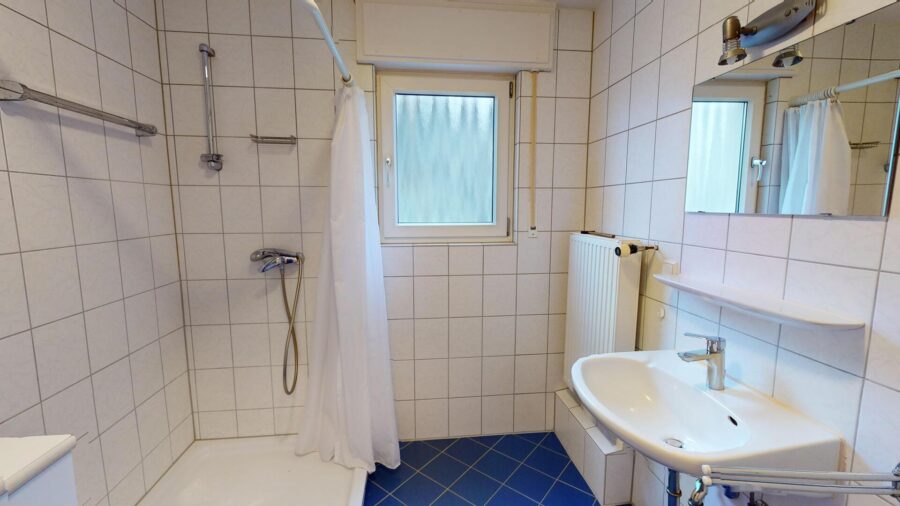 - Badezimmer mit großer, fast bodengleicher Dusche sowie Waschmaschinenanschluss und Platz für Trockner