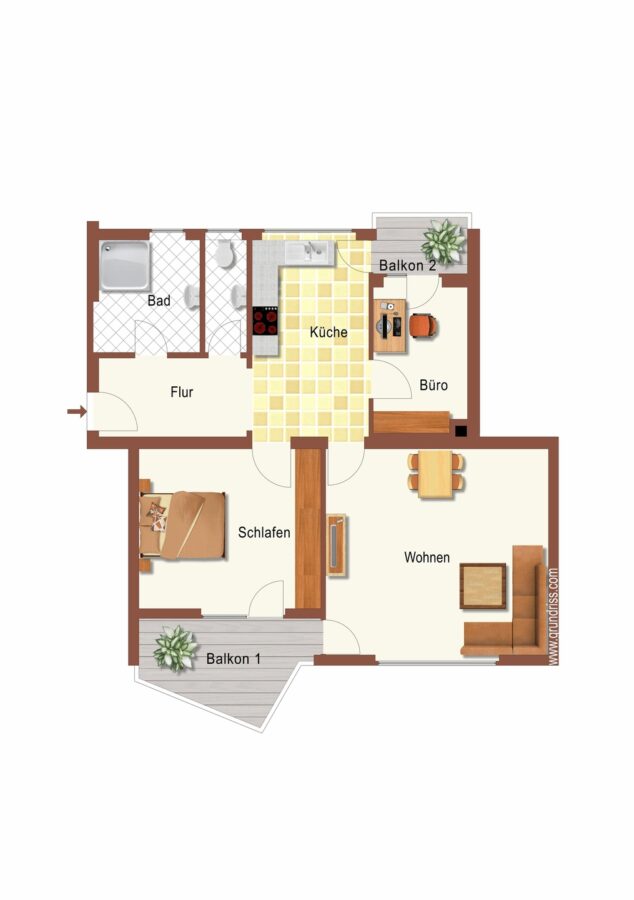 Wohn- sowie Schlafzimmer jeweils mit Zugang zum Balkon; Büro mit Loggia; Küche mit EBK, Essbereich und Loggia-Zugang; helles Tageslichtbad mit Dusche und WMA; WC separat; Flurbereich mit Abstellraum.